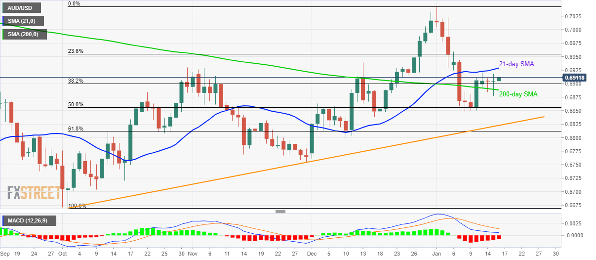 - AUD/USD stays positive above 200-day SMA, 38.2% Fibonacci retracement.