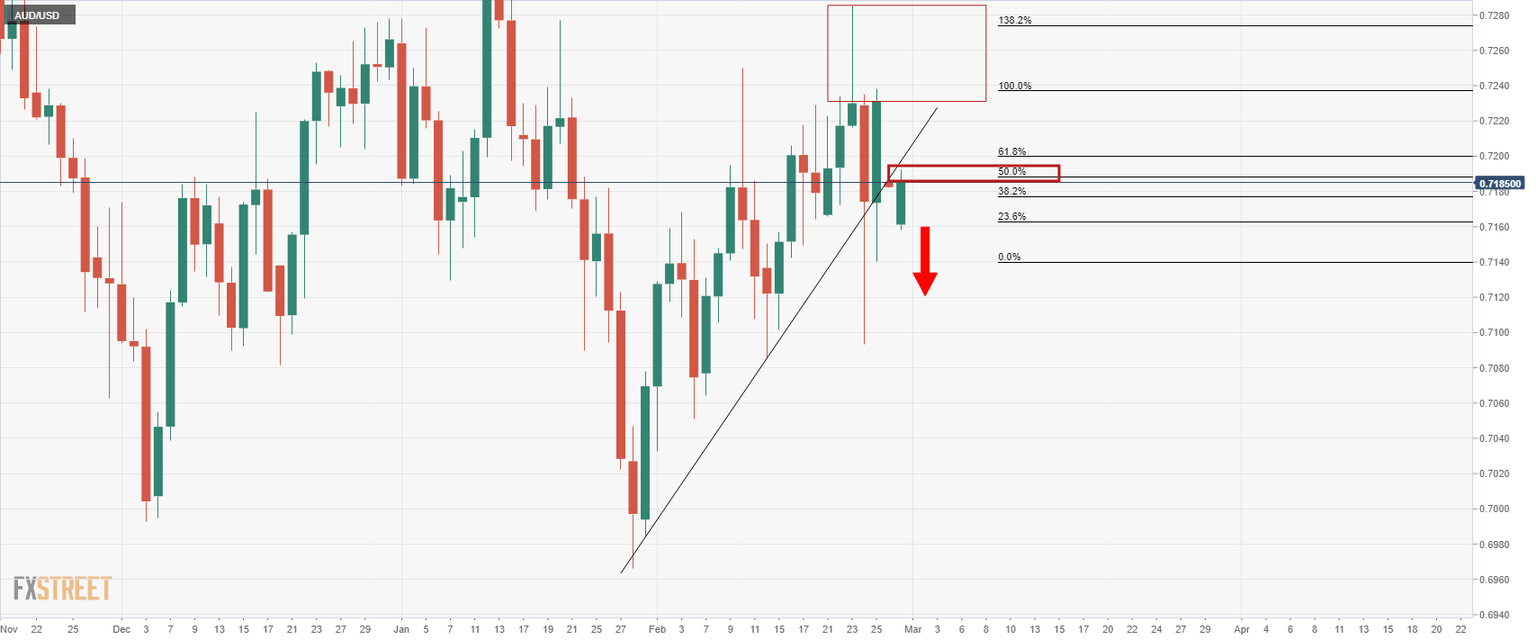 - AUD/USD bears eye between 0.7150 and the 0.7090s.