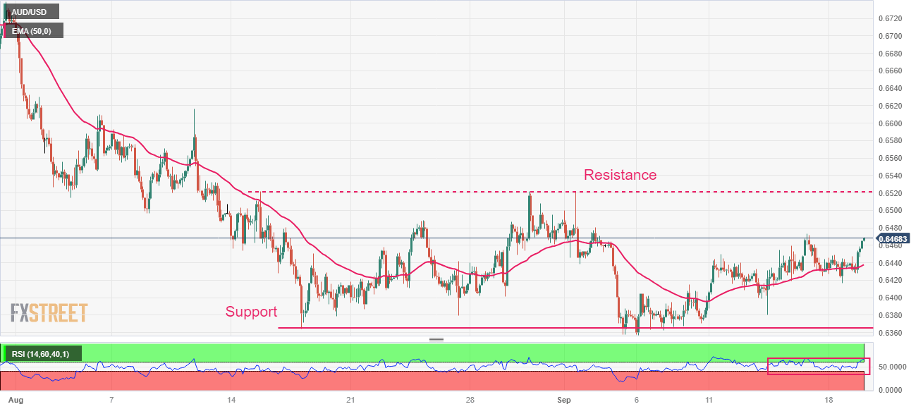 The AUD/USD pair delivers an upside break of the consolidation formed in a range of 0.6430-0.6450 in the European session. The Aussie asset picks strength as the US Dollar Index (DXY) eases ahead of the Federal Reserve (Fed) monetary policy, which will be announced on Wednesday.
