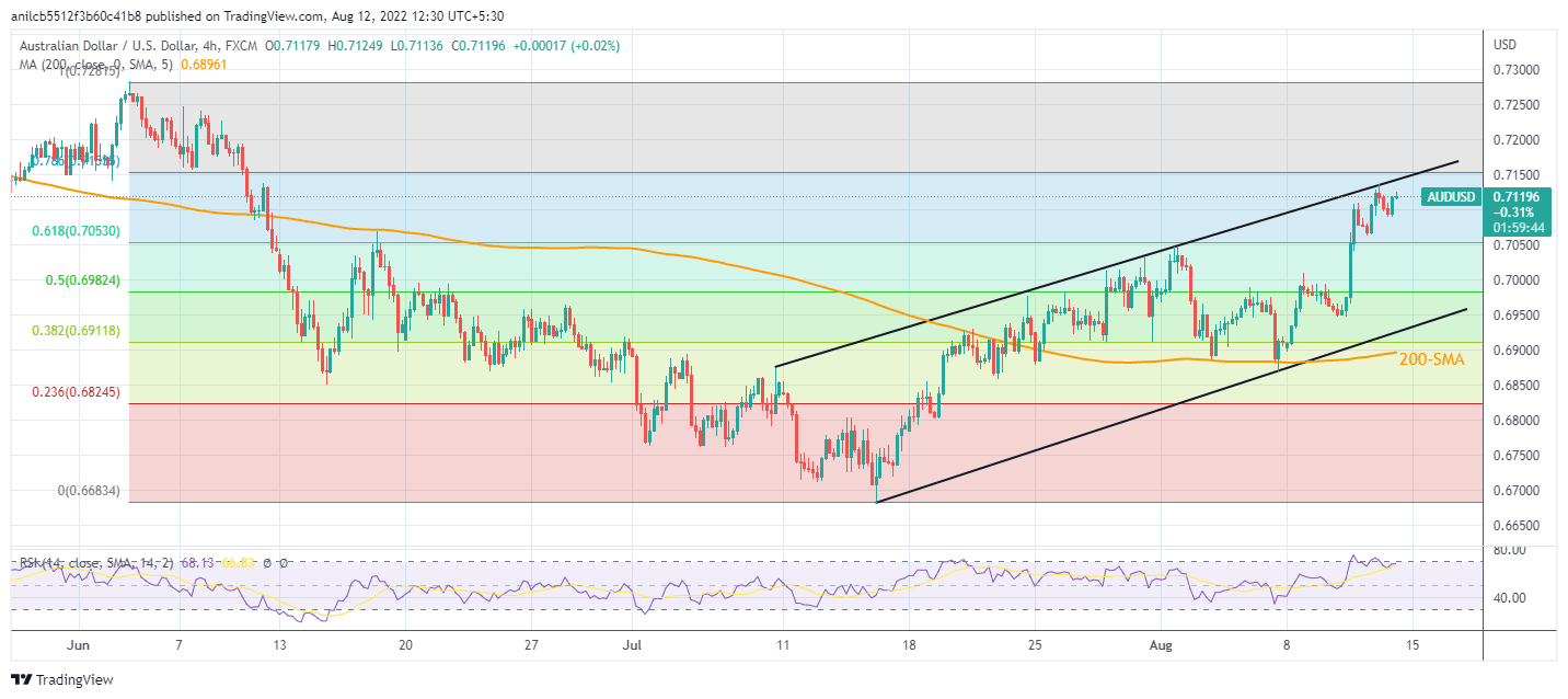 AUD/USD grinds higher around intraday top surrounding 0.7125 heading into Friday’s European session. In doing so, the Aussie pair remains inside a one-month-old upward sloping bullish trend channel while rising for the third consecutive day.