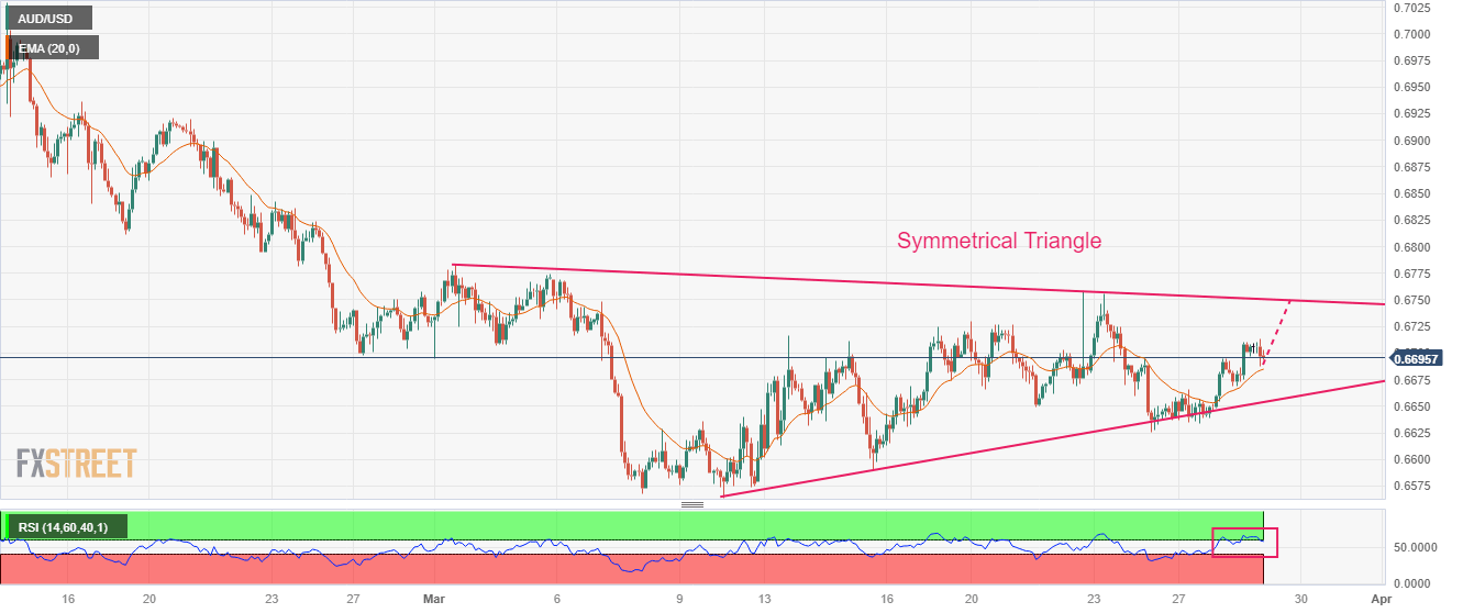 On a two-hour scale, AUD/USD has shown a decent upside after sensing strength near the upward-sloping trendline of the Symmetrical Triangle chart pattern, which is placed from March 10 low at 0.6564. The downward-sloping trendline of the chart pattern is plotted from March 01 high at 0.6784.