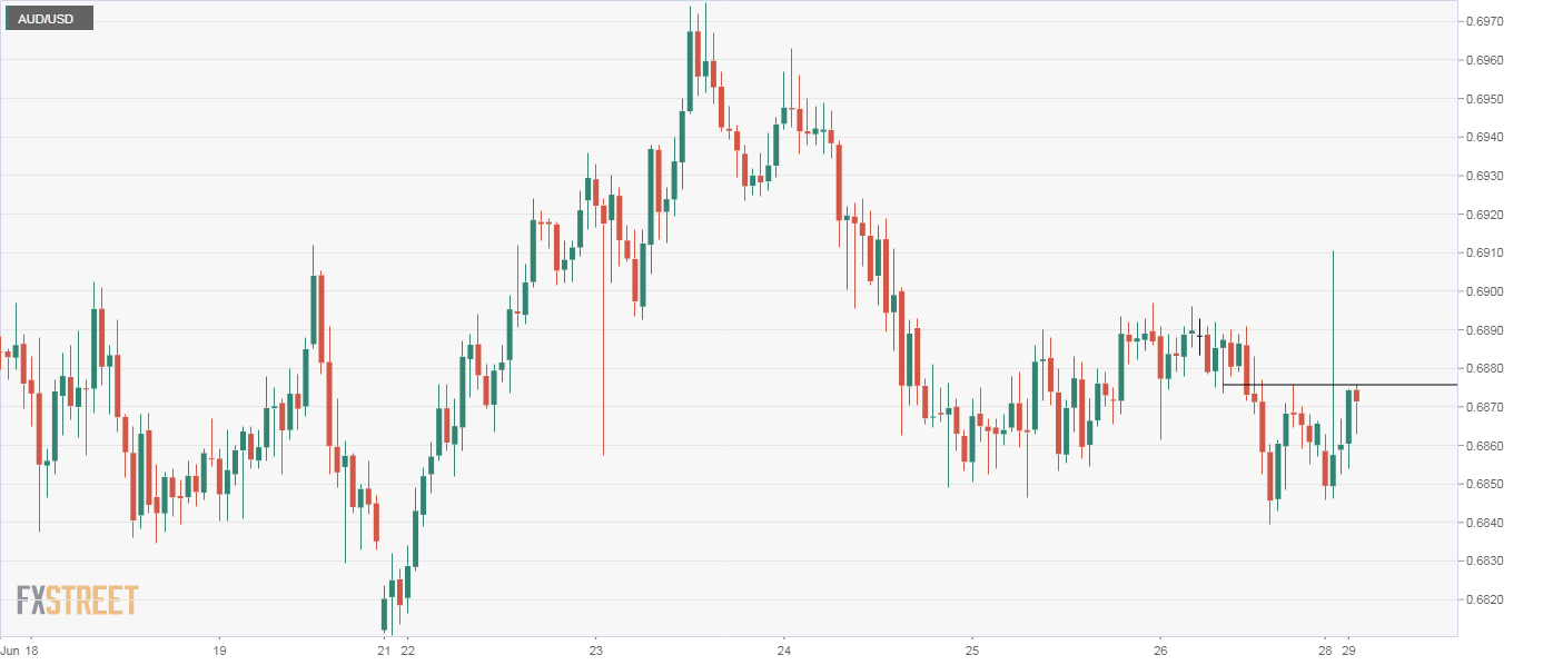 The AUD/USD pair has recovered to the 50-hour simple moving average (SMA) of 0.6872 from the session low of 0.6850, tracking the positive turn in the S&P 500 futures.