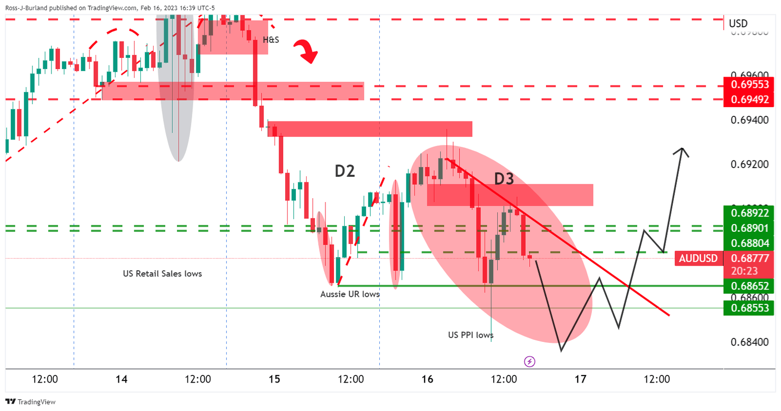 AUD/USD has stalled on the bid and has been making tracks to the downside in the last couple of hours in the hunt for territory below 0.685o lows. The pair needs to get below there or face immediate p[pressures to the upside for the bulls searching for money above 0.6920. The following illustrates the market structure and the developments over the course of this week's template and arrives at a semi-bullish bias for the end of the week.