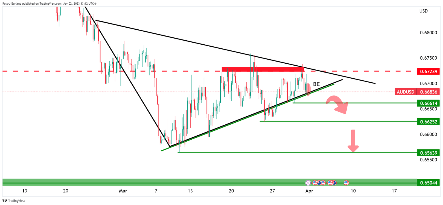 The bearish engulfment, BE, on the last 4-hour candle could be the catalyst for a firm break of structure for the opening sessions near 0.6661 with 0.6625 eyed below there guarding the 0.6550s.