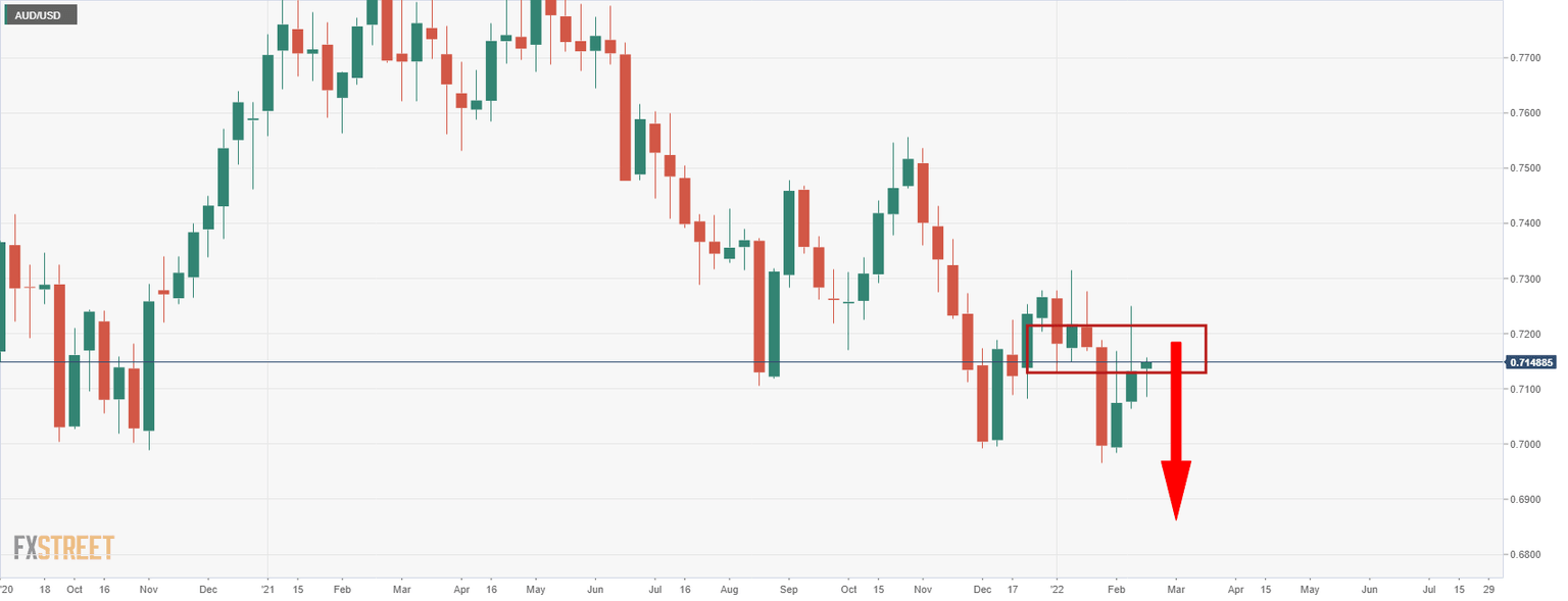The focus is on the downside for a restest of the support near 0.7150. Below there, the bears could be encouraged to move to the longer-term charts and assess the landscape as follows:
