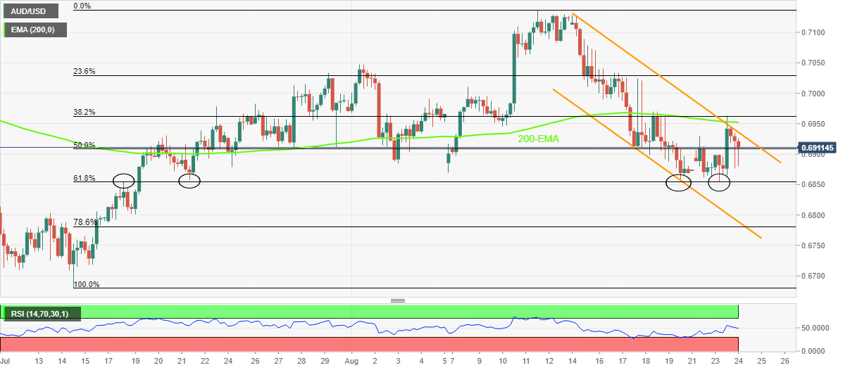 Alternatively, recovery moves need to defy the bearish channel formation with a clear upside break of 0.6940, as well as stay beyond the 200-EMA level of 0.6952, to convince AUD/USD buyers.