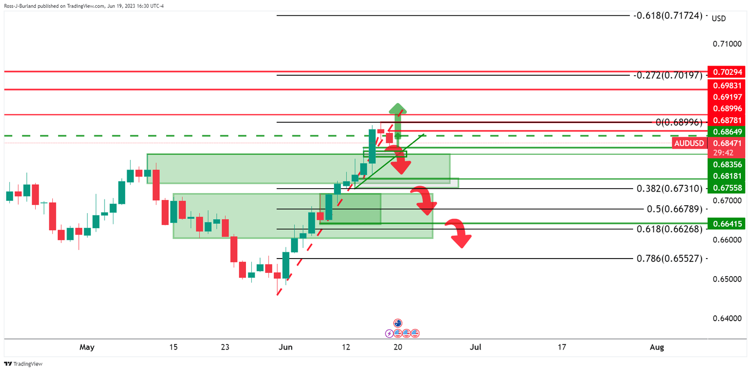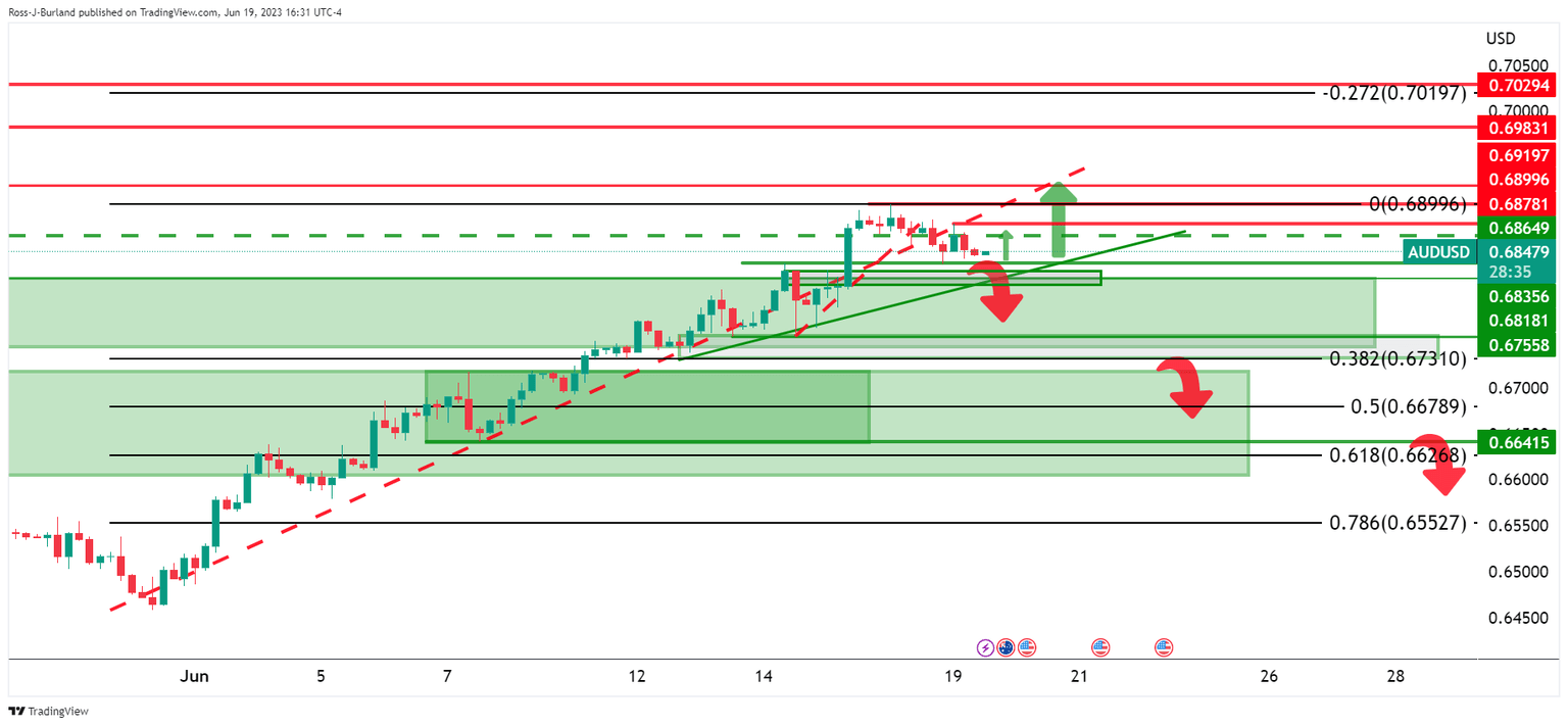 AUDUSD remains offered following Friday's sell-off and in what could be the start of a significant correction. The bulls have been capped below 0.6900 and the bears are trying to take on dynamic trendline support and the prior highs of June 14 in what has been a 38.2% Fibonacci retracement of the 4-hour bullish impulse as the following charts illustrate:
