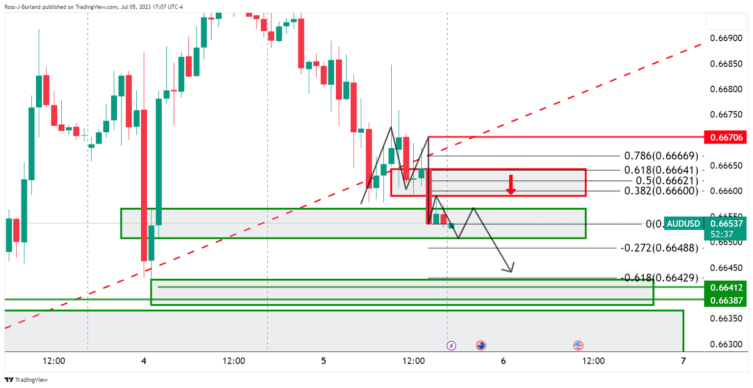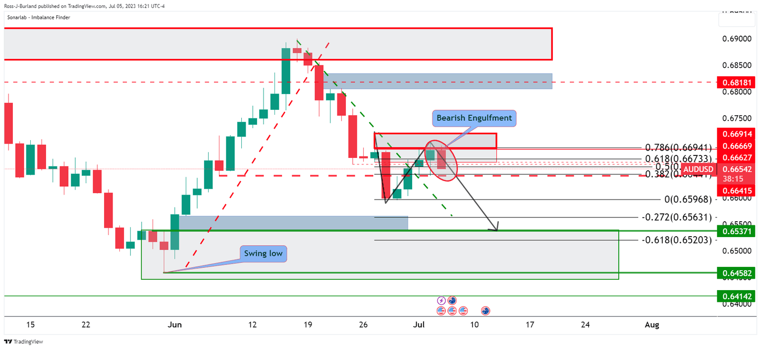 AUD/USD Price Analysis: Bears move in and eye 0.6620s and a weekly 61.8% ratio