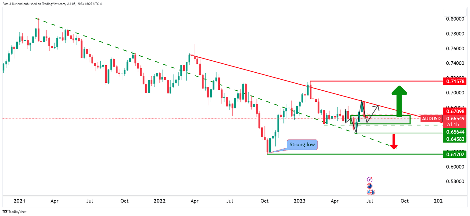 Meanwhile, from a technical perspective, AUD/USD bulls have moved aside and the bears are taking control into a key support area on the charts as the following multi-time-frame analysis will illustrate