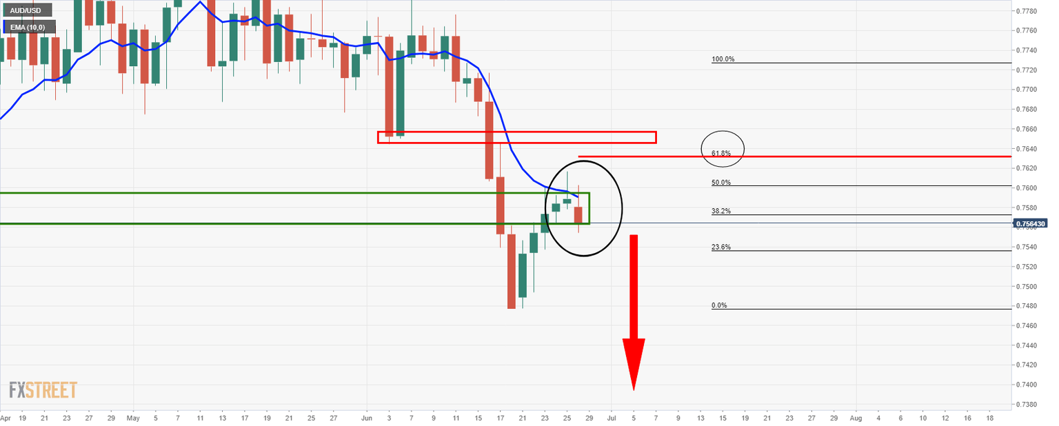 0.7420 is now the downside target for the bears if the current 4-hour resistance, on a restest, can hold off the monthly demand from the bulls:
