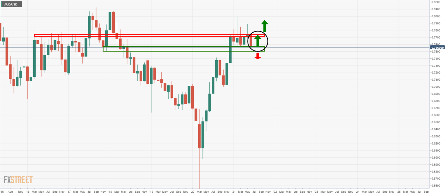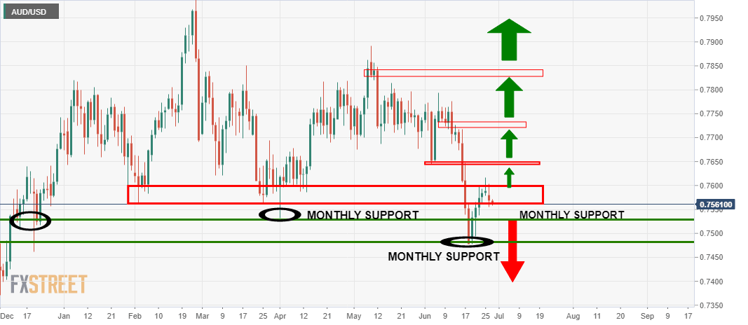 - AUD/USD bulls are stepping in at a critical level of monthly support as the last defence.