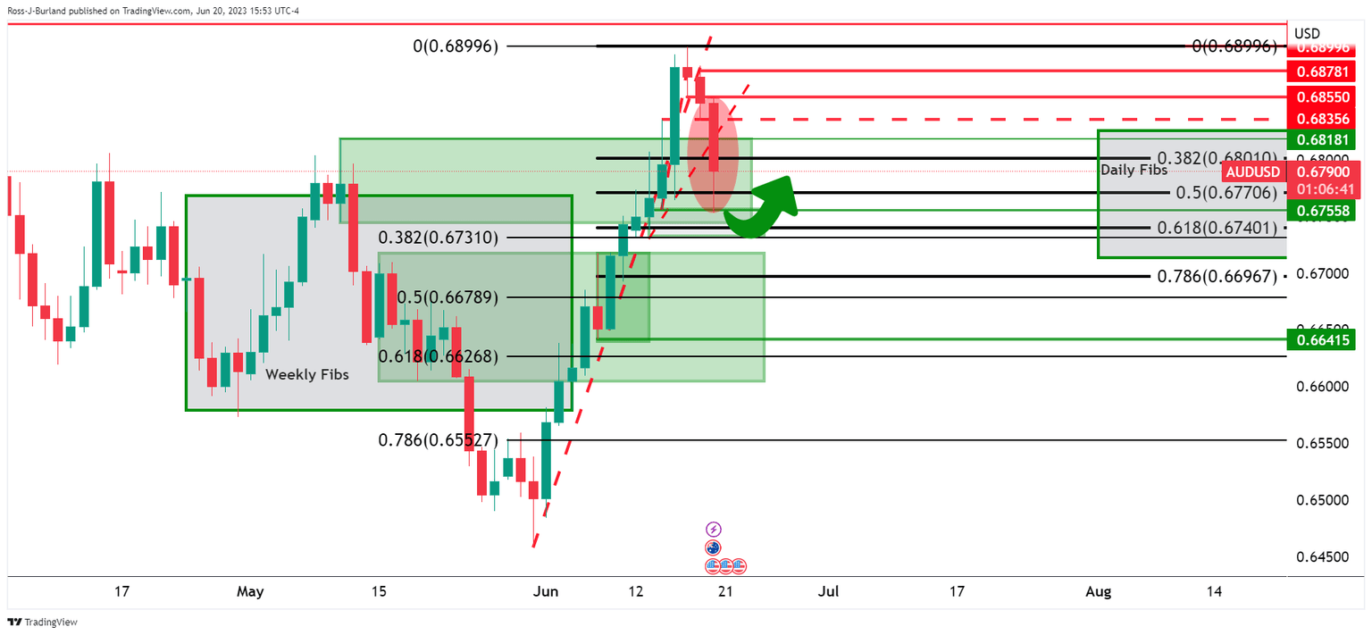 The price has continued lower in a 50% mean reversion of the daily bullish impulse at 0.6770 reaching a low of 0.6753 and towards a weekly 38.2% Fibonacci level near 0.6730.