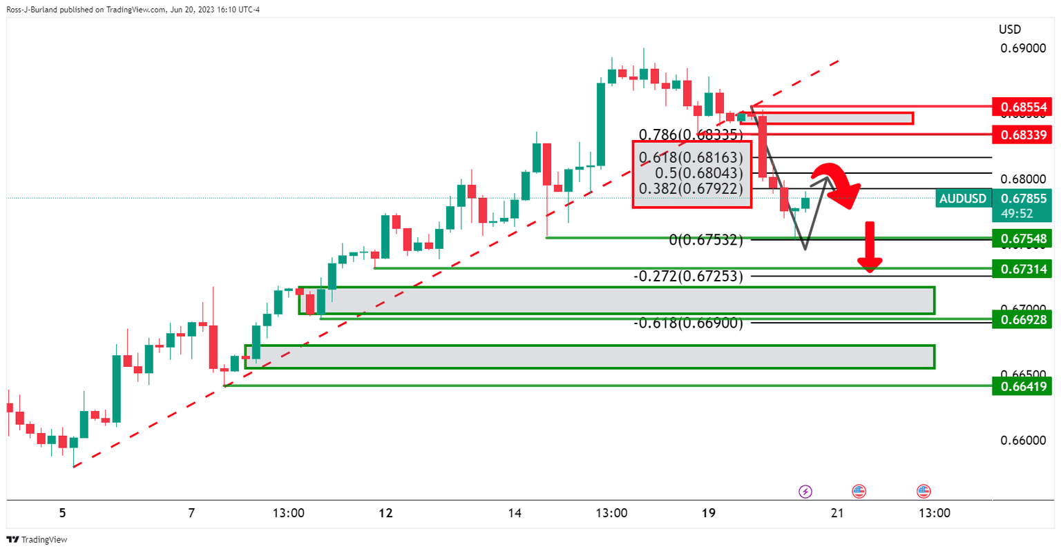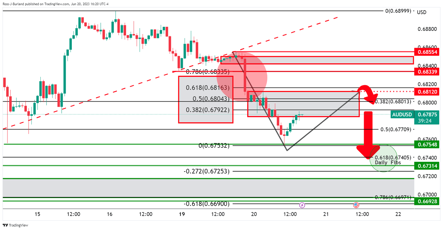 The 4-hour chart shows the price correction from the 0.6750 area. This leaves prospects of a move-in on the 38.2% Fibonacci a 50% mean reversion to test the 0.68 figure again and even a 61.8% ratio higher up prior to the next downside impulse getting underway.