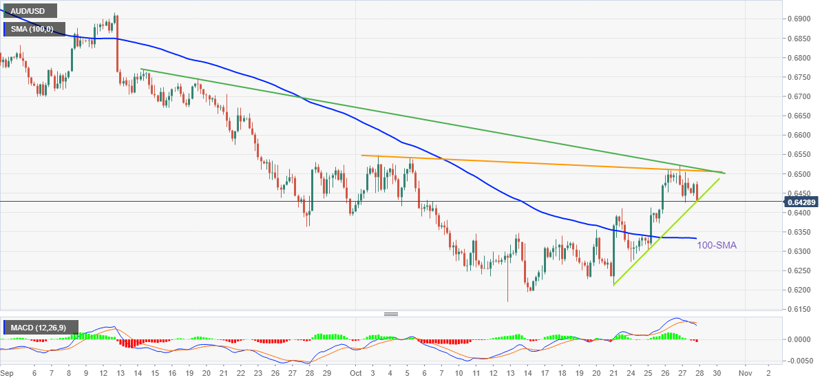 AUD/USD sellers poke the weekly support line near the intraday low surrounding 0.6430. In doing so, the Aussie pair prints the second consecutive intraday loss during early Friday morning in Europe.