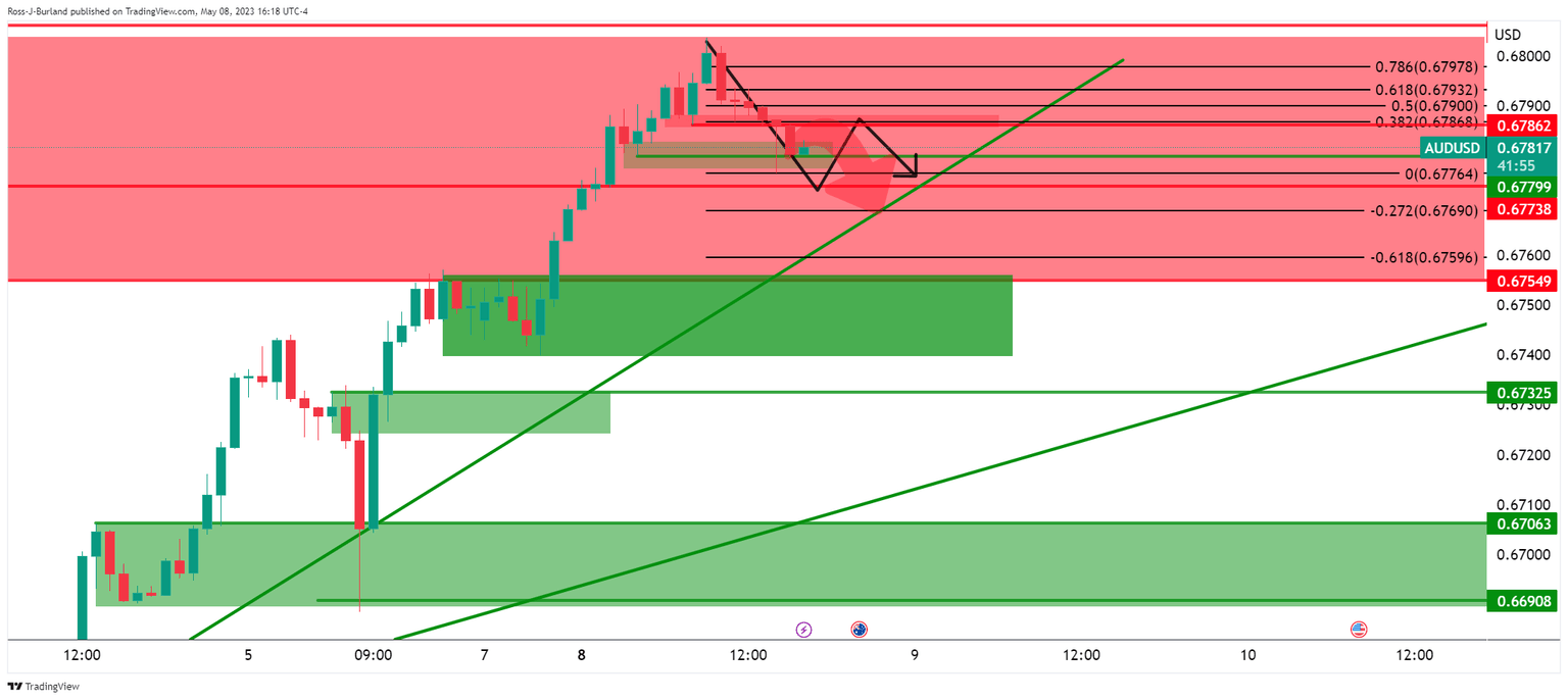 The Australian Dollars has been buoyant at the start of the week as the US Dollar continued its retreat amid bets that US interest rates might have peaked, This has seen the price action move deeper into resistance as the following will illustrate: