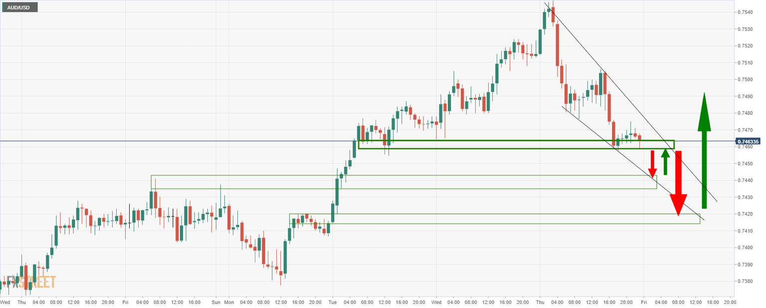 The following is what might be expected of a move below the current support structure in the 0.7450s. A break to the 0.7430s would put bulls under pressure defending support territory at 0.7420.