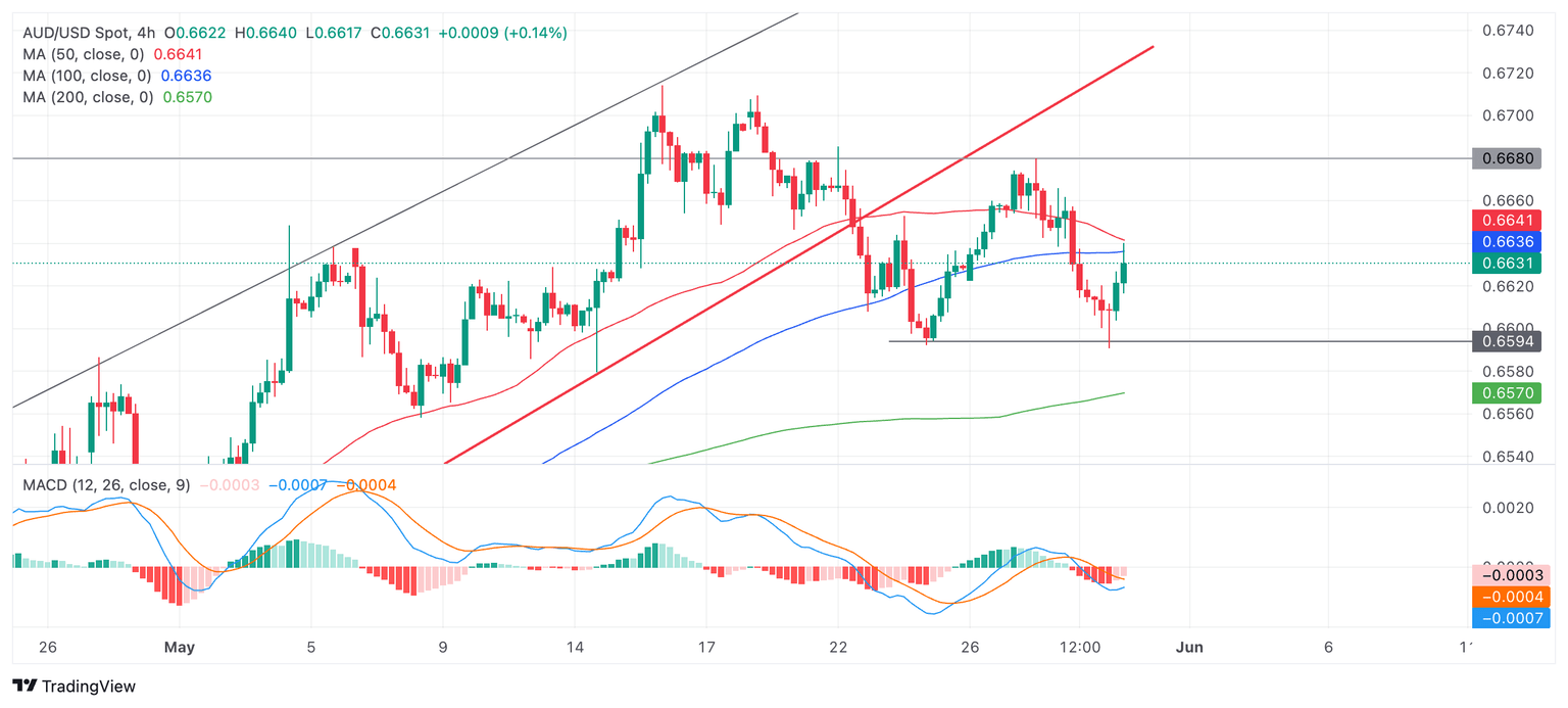 AUD/USD trades about a third of a percent higher in the 0.6630s on Thursday after finding support and bouncing from the May 24 swing lows.