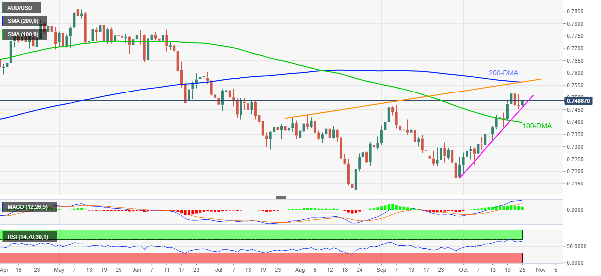 AUD/USD again rebounds from a monthly support line, snapping a two-day downtrend while refreshing the daily high around 0.7485 ahead of Monday’s European session.