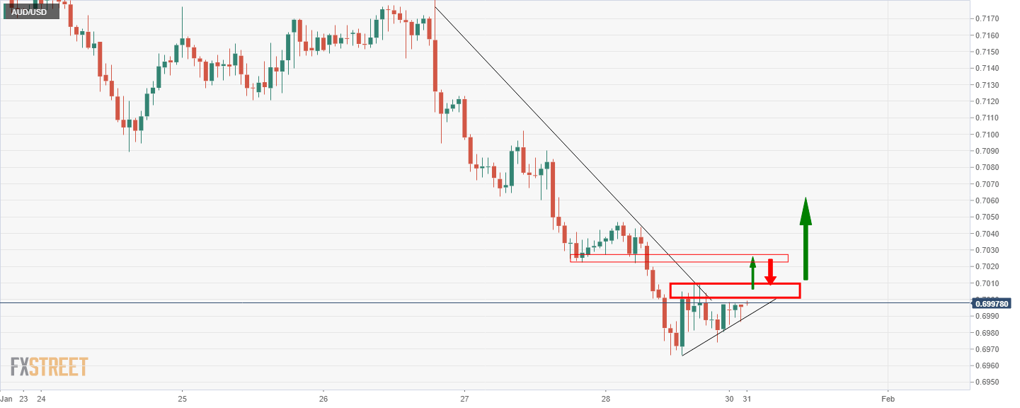 AUD/USD bulls are attempting to correct the downtrend. The price is stuck below 0.7010 resistance but the lower time frame offers a compelling series of accumulation that could result in a strong move towards the next hourly layer of resistance near 0.7080.