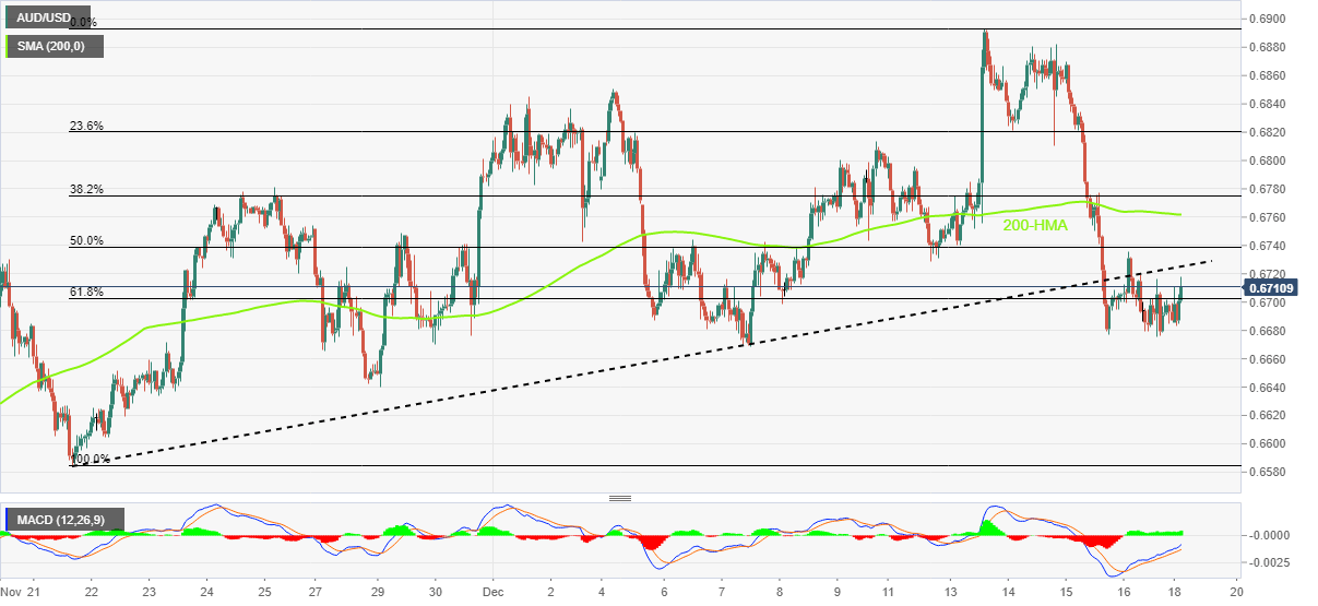 Given the Aussie pair’s multiple failures to defend the bounce off the recent lows, AUD/USD is likely to remain bearish unless crossing the support-turned-resistance line from November 21, around 0.6725.