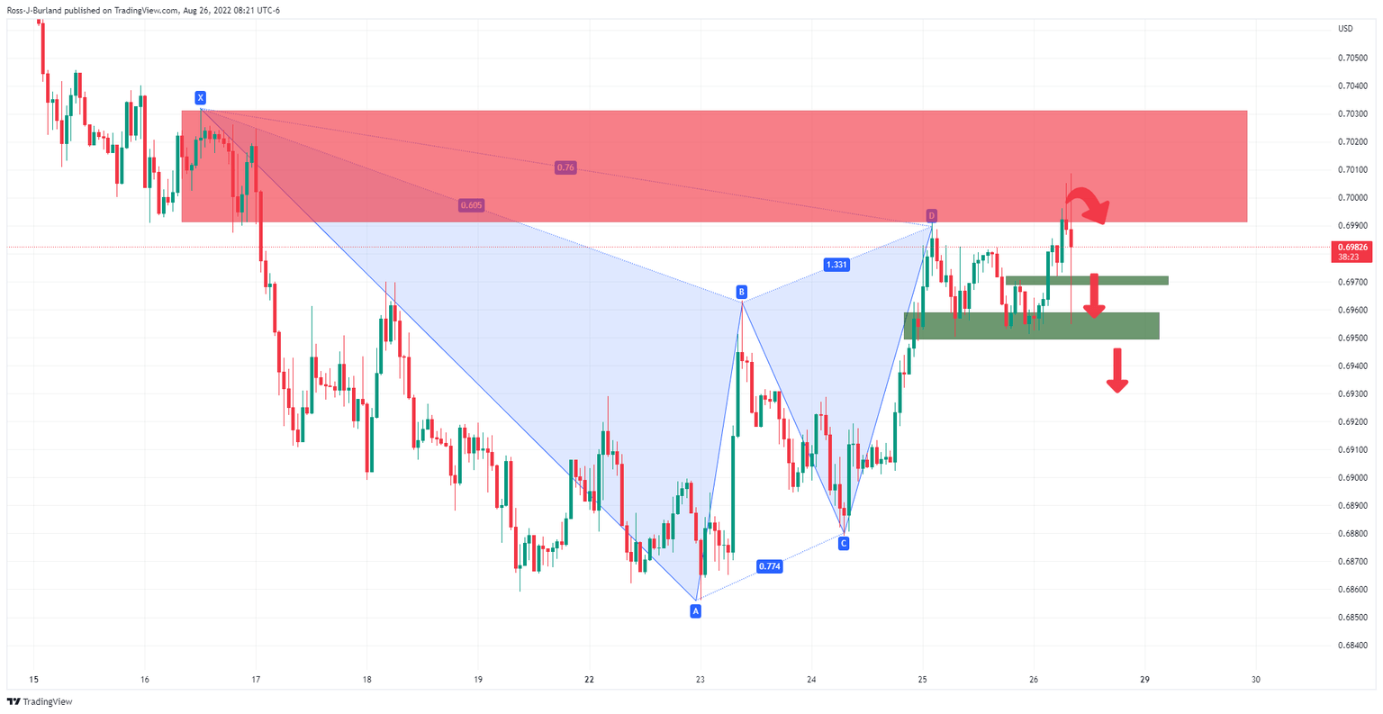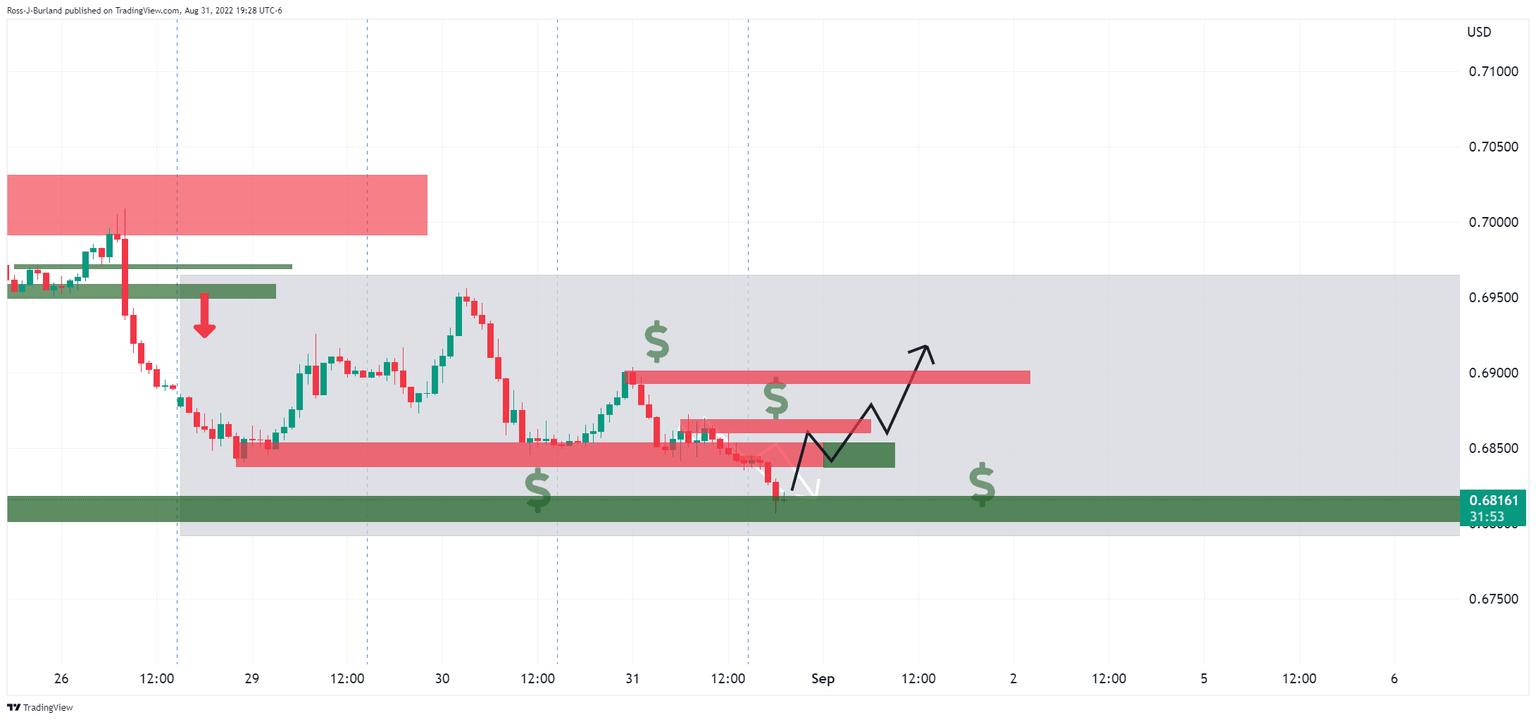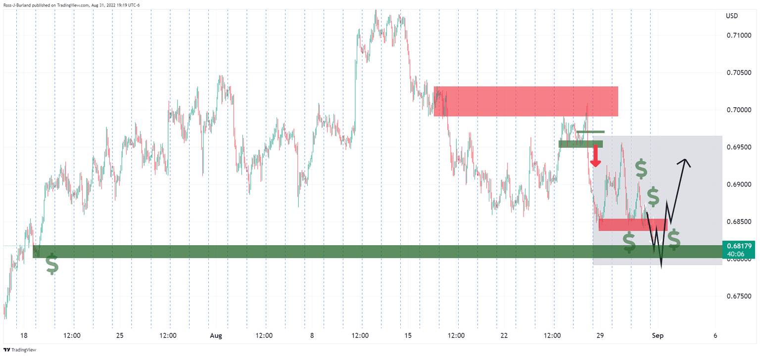 The bulls set a high for the week in the 0.6950s and the price is now carving out a fresh low for the week. Given the timings of the week, a pullback into stops above recent peaks could be in order for the day ahead before Nonfarm Payrolls on Friday:
