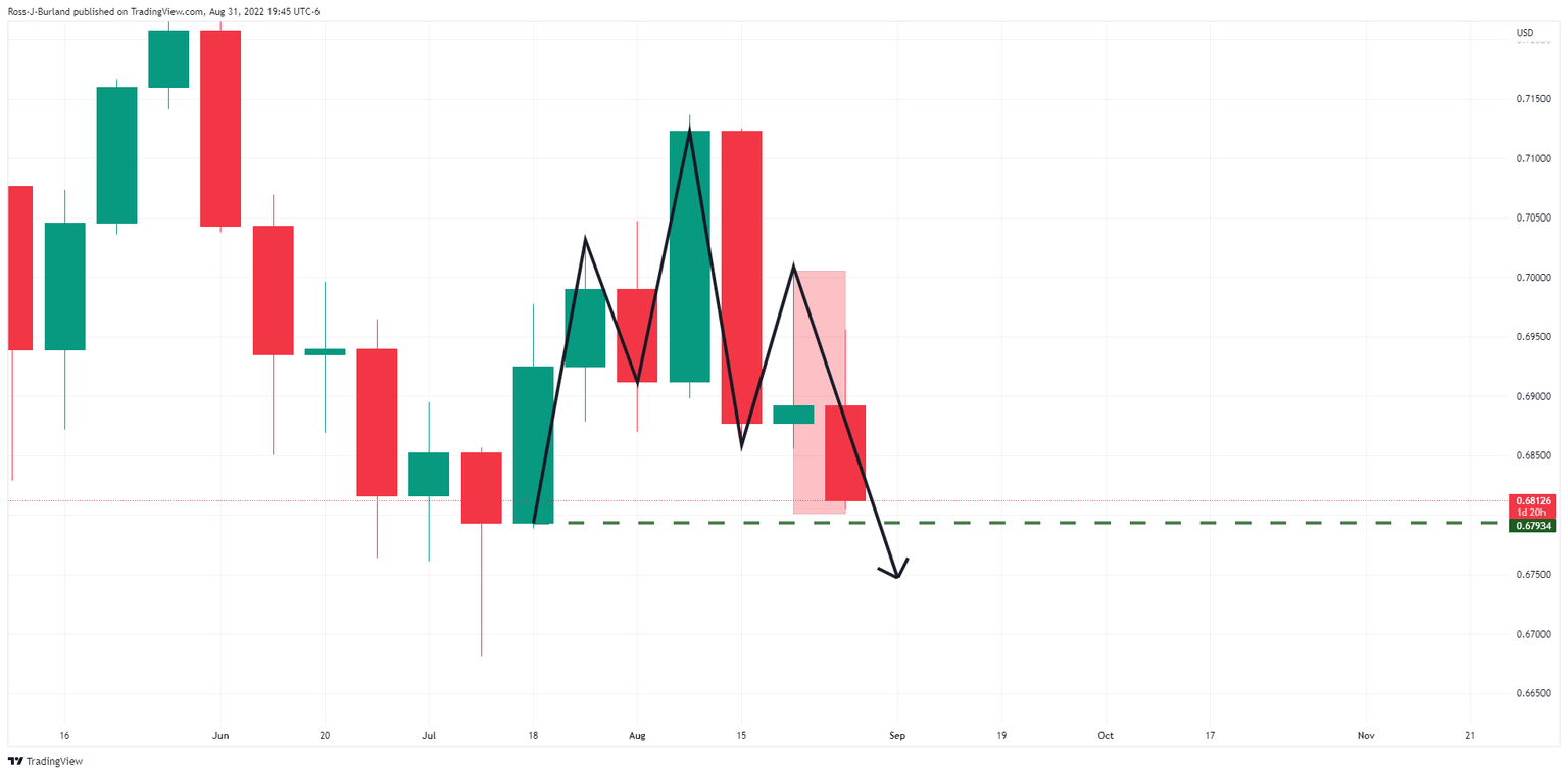 On the other hand, if the US dollar bulls stay in charge all the way into Friday's data, a break of 0.6790 as per the weekly chart could see a significant downside breakout: