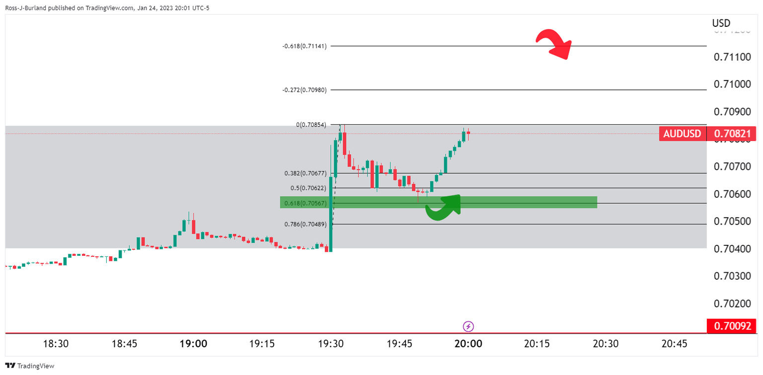 AUD/USD bulls have moved in at a 61.8% Fibonacci retracement level following the correction of the high-impact data event in today's Tokyo session as the following illustrates.