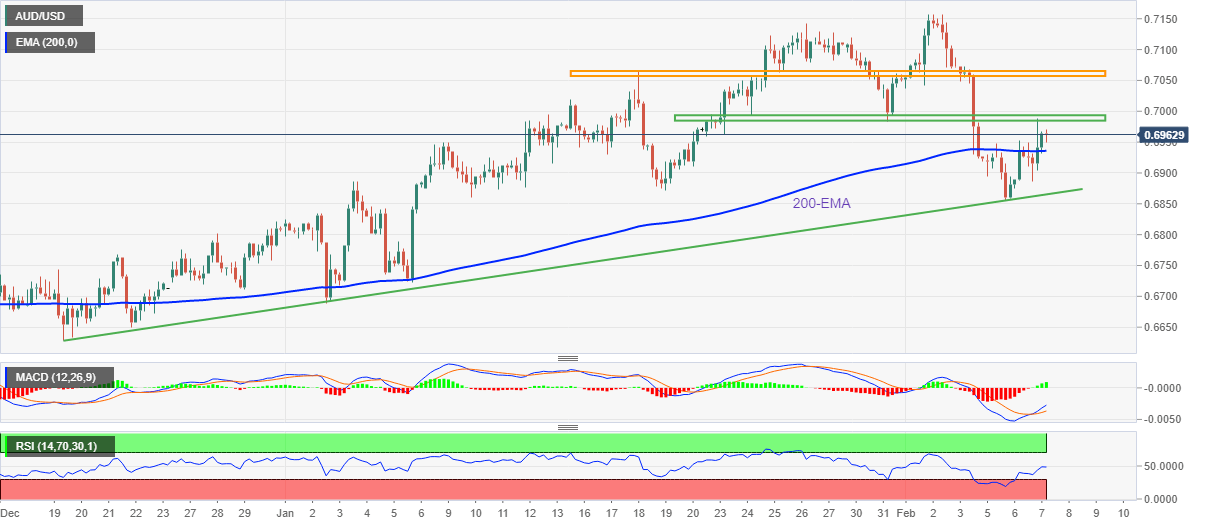 AUD/USD holds onto the previous day’s recovery moves near 0.6960 as buyers keep the reins on crossing the 200-bar Exponential Moving Average (EMA) during early Wednesday. In doing so, the Aussie pair marches towards a fortnight-old horizontal resistance region amid bullish signals from MACD and a gradual rise in the RSI (14) line.