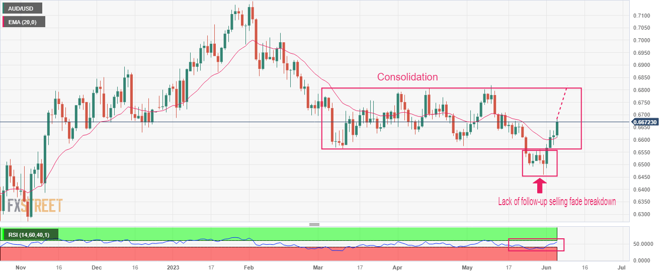 - AUD/USD witnessed a sharp recovery despite delivering a breakdown of the consolidating formed in a range of 0.6563-0.6808.
