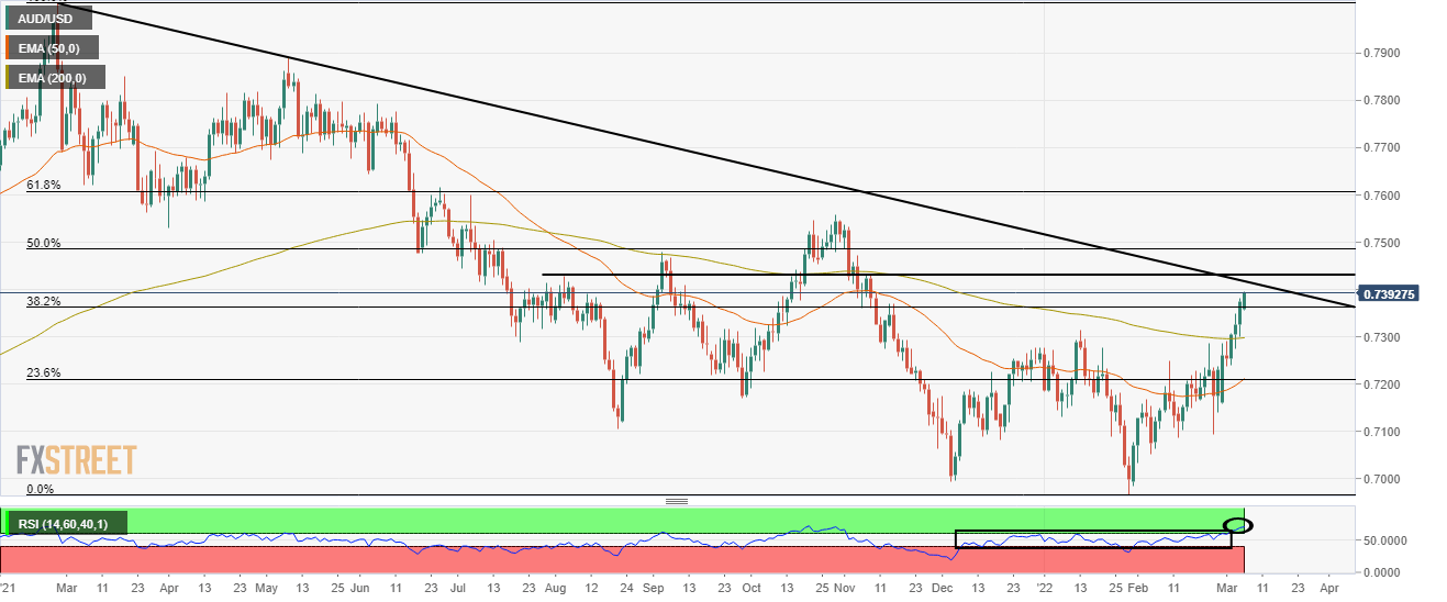 On the daily scale, AUD/USD has established a bullish bias after overstepping the 38.2% Fibonacci retracement at 0.7364, which is placed from February 25 high at 0.8008 to January 28 low at 0.6966. The major is comfortable holding above 50-period and 200-period Exponential Moving Averages (EMA), which are trading near 0.7210 and 0.7300 respectively, and add to the upside filters.