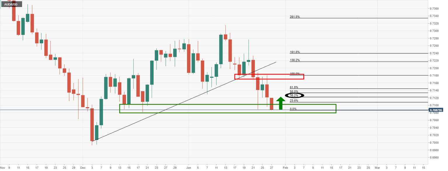 AUD/USD has met the downside target as illustrated above and would be now expected to hold at this level of support: