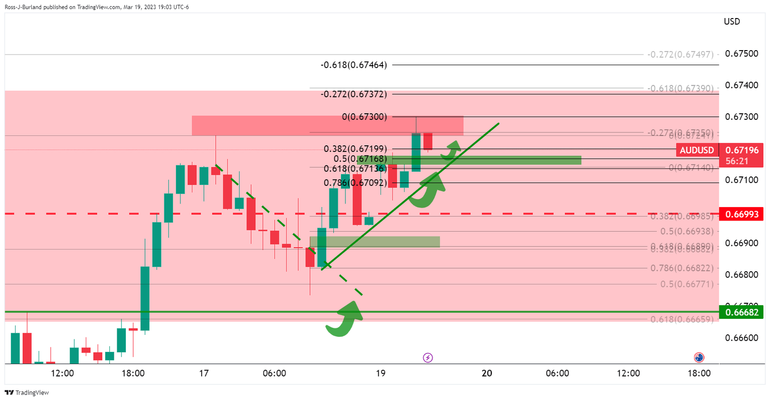 As per AUD/USD´s prior analysis, AUD/USD Price Analysis: Bulls eye a break into the 0.67s, the bulls are making their way up and there is a focus on a bullish extension while on the front side of the trendline.