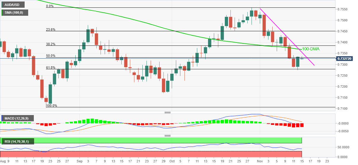However, the MACD signals remain favorable to the bears and hence highlight the two-week-old descending trend line, around 0.7355, followed by the 100-DMA level of 0.7367, as crucial upside barriers.