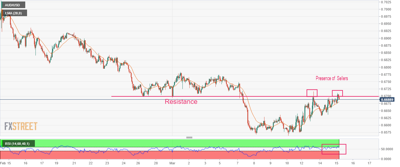AUD/USD has scaled to near the horizontal resistance plotted from February 27 low at 0.6700. The Aussie asset is facing selling pressure from the market participants and investors should build positions after a decisive move.