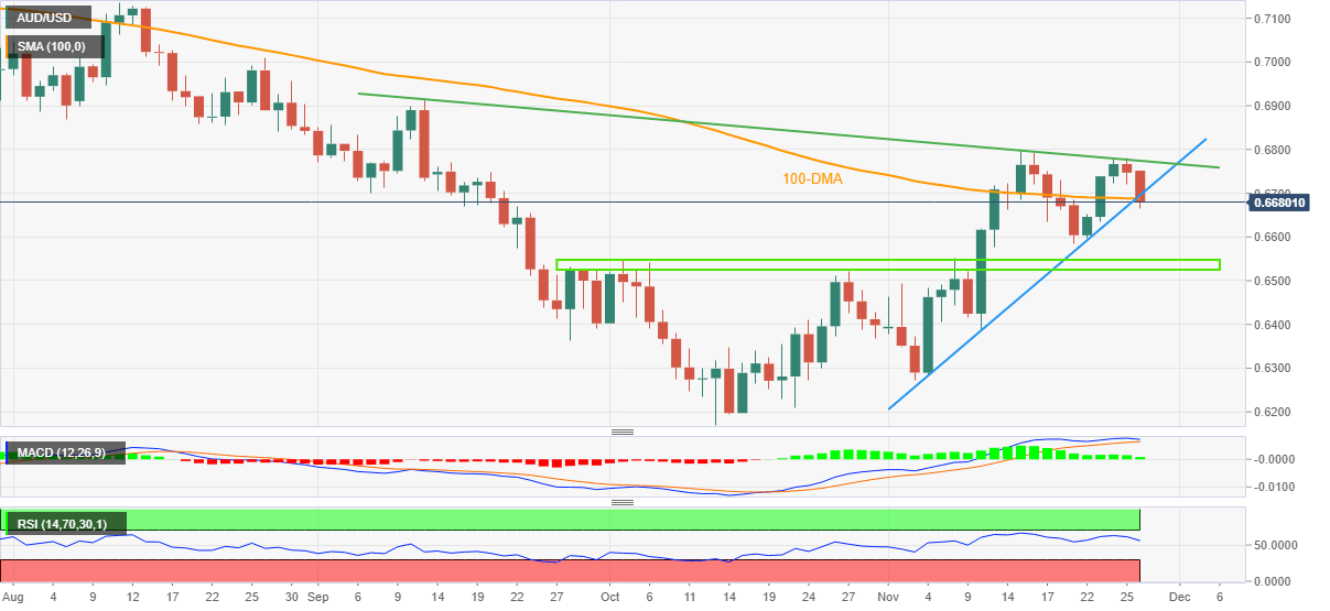 That said, a joint of the 100-Day Moving Average (DMA) and an upward-sloping trend line from November 04, close to 0.6690, appears a tough nut to crack for the AUD/USD pair bears.