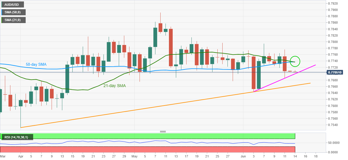 AUD/USD pokes intraday high of 0.7711 amid a quiet Asian session, due to off in Australia and China, on Monday. Even so, a looming bearish cross-over of the 50-day SMA to 21-day SMA keeps sellers hopeful.