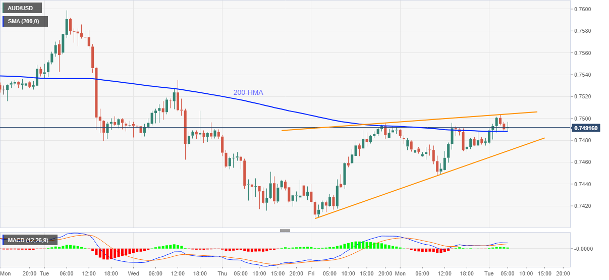 AUD/USD holds onto the day-start gains around 0.7500, up 0.26% intraday, as European traders brace for Tuesday’s work. In doing so, the Aussie pair stays above 200-HMA while staying inside the bearish chart pattern, rising wedge, on the hourly play.