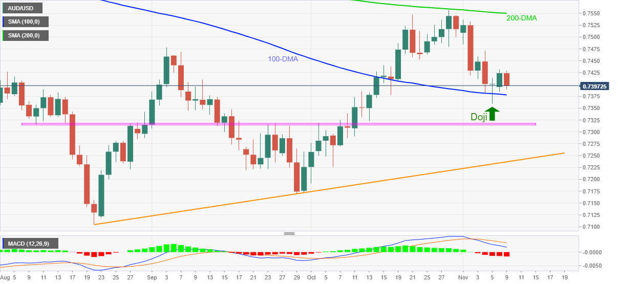 Meanwhile, recovery moves need validation from October 22 low and September’s peak, near 0.7450 and 0.7480 in that order, to recall the AUD/USD buyers.
