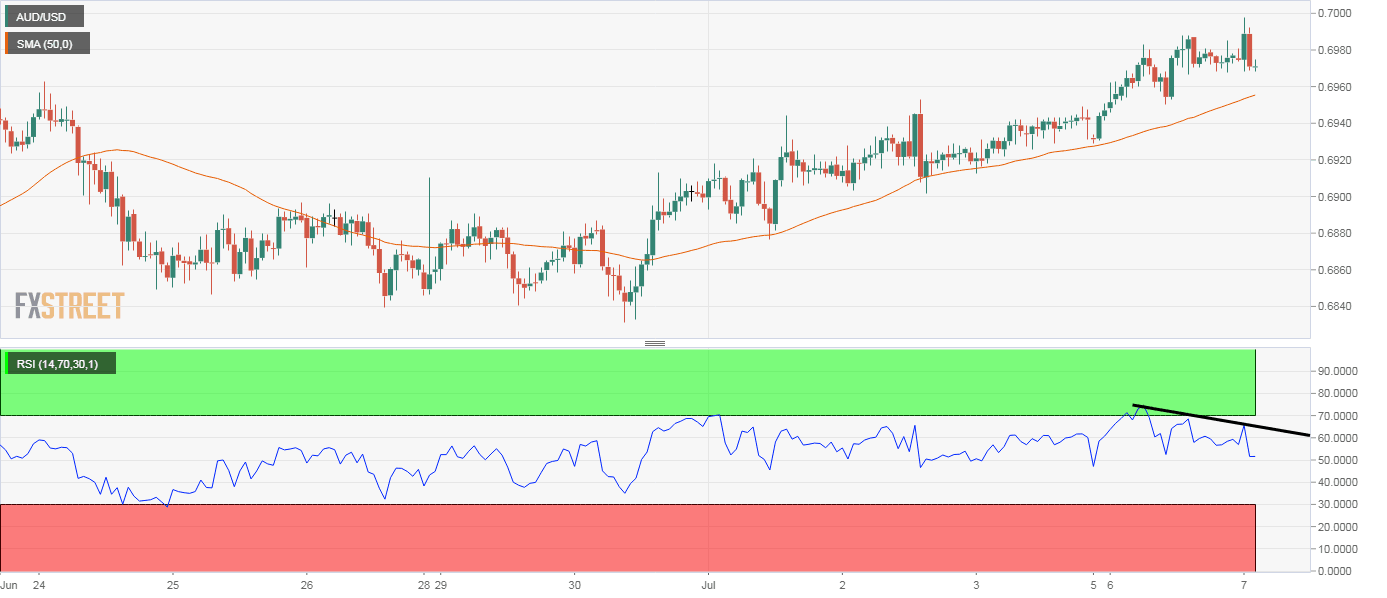 - AUD/USD pulls back from session highs, confirming a bearish divergence of RSI.