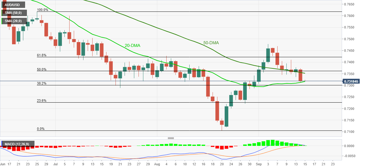 AUD/USD stays depressed around 0.7315 after declining the most in a week the previous day. Although 20-DMA challenges the pair sellers, a clear downside break of 50-DMA, backed by downbeat MACD signals, keeps bears hopeful.