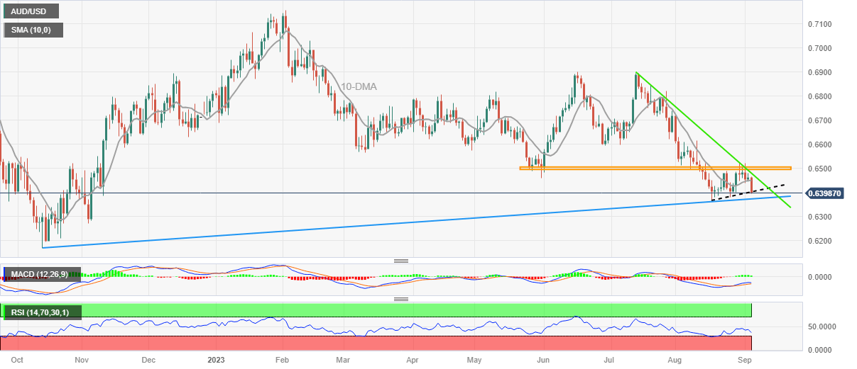 However, the below-50.0 levels of the RSI (14) line suggest bottom-picking of the Aussie pair and hence highlights an upward-sloping support line from October 2022, close to 0.6370 at the latest, as an important support to watch. Also acting as the downside filter is the previous monthly low of around 0.6365.