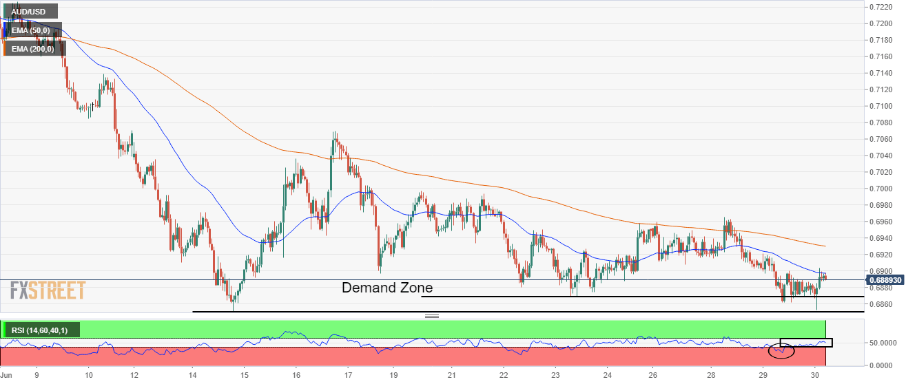On an hourly scale, aussie bulls have attracted some significant bids after testing the critical demand zone placed in a narrow range of 0.6850-0.6867. A responsive buying action has been witnessed, which strengthened the asset to attack the 50-period Exponential Moving Average (EMA) at 0.6898. While, the 200-period EMA at 0.6930 is still higher than the asset, which indicates that the long-term trend is still down.