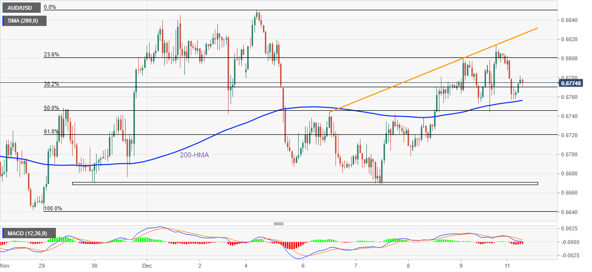 AUD/USD retreats to 0.6775 as it defies the three-day winning streak heading into Monday’s European session. In doing so, the Aussie pair retreats toward the 200-Hour Moving Average (HMA) amid the bearish MACD signals.