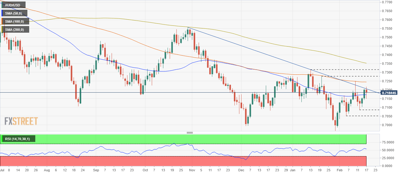 However, the AUD/USD path of least resistance is downwards. The first support would be the 50-DMA at 0.7170. A clear break would send the pair tumbling to February 14 daily low at 0.7085, followed by the February 4 daily low at 0.7051.