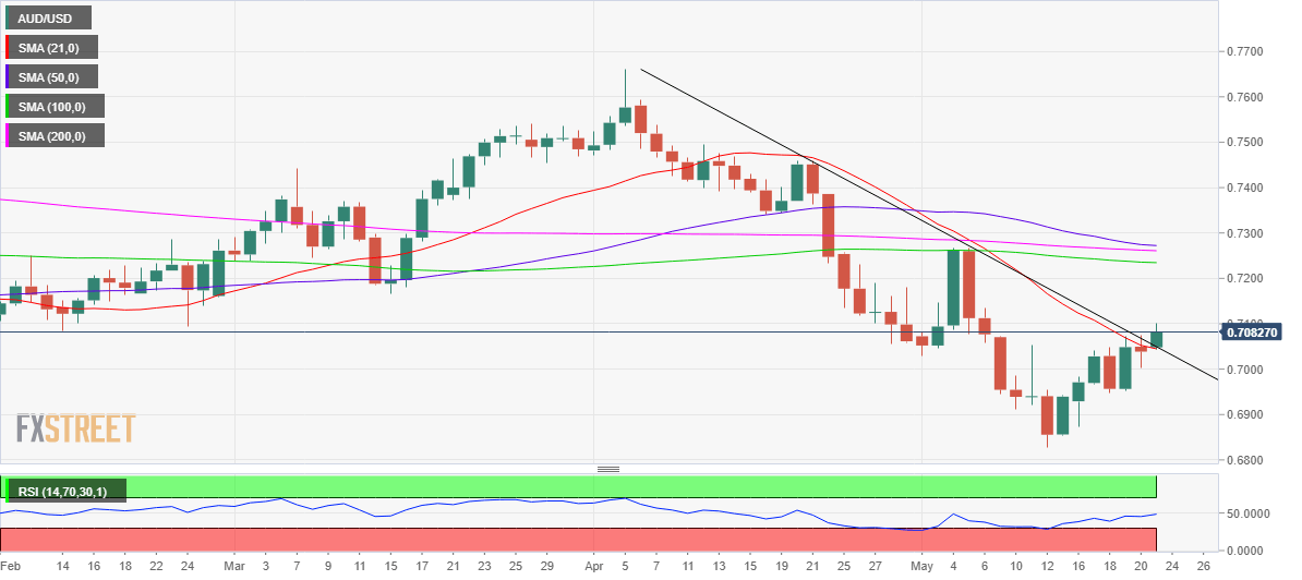 Technically, AUD/USD has found a strong foothold above the bearish 21-Daily Moving Average (DMA) at 0.7044 after a down day seen on Friday.