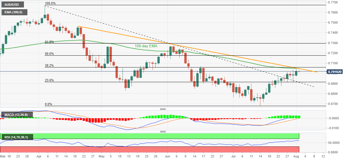 It’s worth noting, however, that the first MACD signals and the RSI (14), not overbought, keep AUD/USD buyers hopeful. On the same line is the Aussie pair’s sustained trading beyond the downward sloping resistance line from April, now support around 0.6910.