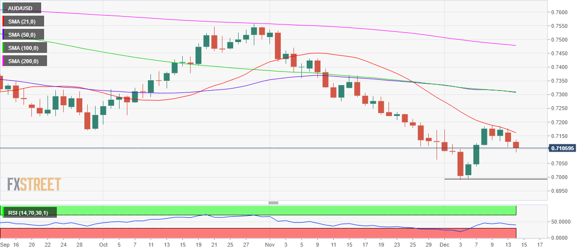 AUD/USD is reversing a brief dip below 0.7100 but the bearish bias remains intact amid a broadly firmer US dollar and the prevalent risk-off market profile.