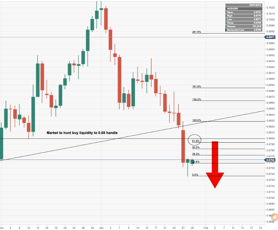 The 61.8% Fibonacci may come as a resistance ahead of 0.68 handle. It is also worth noting that should the data not be a catalyst for significant price action, so long as the data is in line with the RBA's forecasts, a bullish scenario, then the price may take some time to grind higher into buy liquidity in the 0.68 handle ahead of the RBA meeting, 4th Feb.