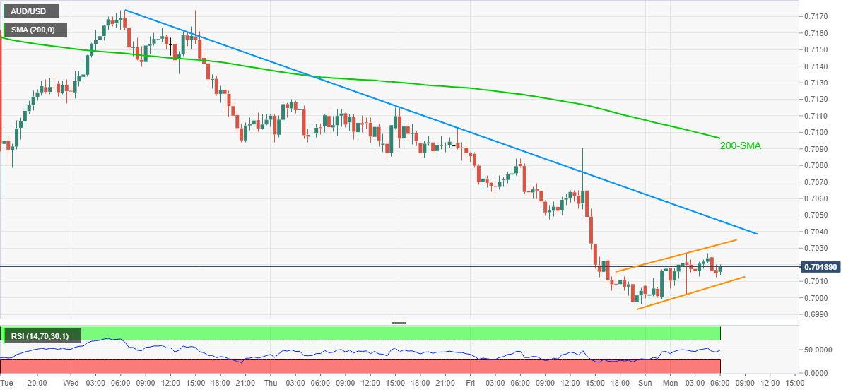 AUD/USD struggles to extend corrective pullback from yearly low, retreats to 0.7015 heading into Monday’s European session. The Aussie pair portrays a short-term bearish chart pattern, called bear flag, on the 30-minute play, up 0.17% intraday at the latest.