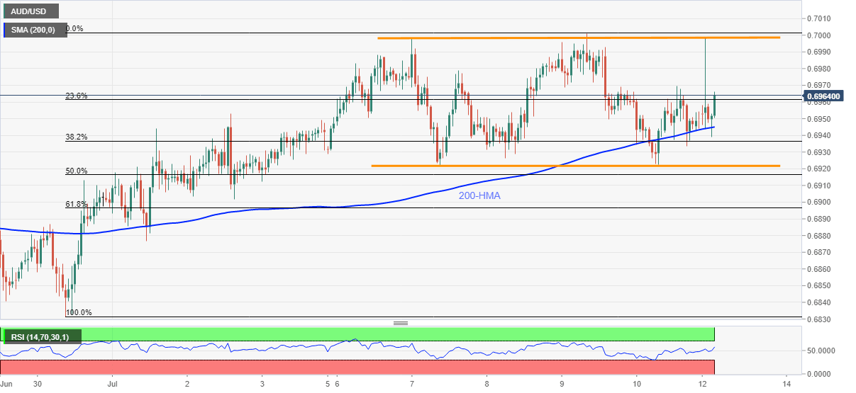AUD/USD rises to 0.6960, up 0.13% on a day, during Monday’s Asian session. The aussie pair recently took a U-turn from 200-HMA while keeping a short-term trading range intact.